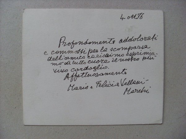 Biglietto di condoglianze scritto e firmato da MARIO VELLANI MARCHI (pittore) 1978