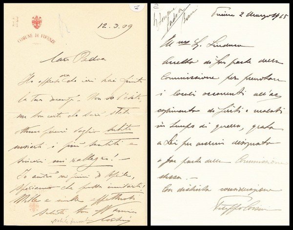 Note: 2 lettere manoscritte e firmate di Filippo Corsini; la prima è su carta intestata "Comune di Firenze" di 1 facciata datata 12 marzo 1909; la seconda è di 1 facciata datata Firenze, 2 Marzo 1915; lettere di auguri e saluti; buon es.
