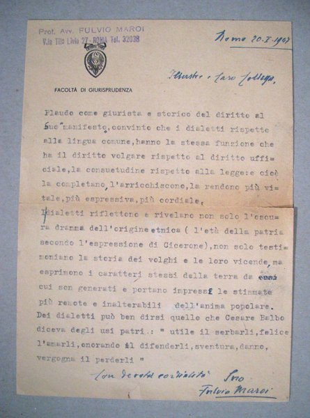 Invio su carta intestata "Facoltà di Giurisprudenza" con firma FULVIO MAROI 1947