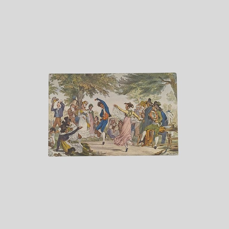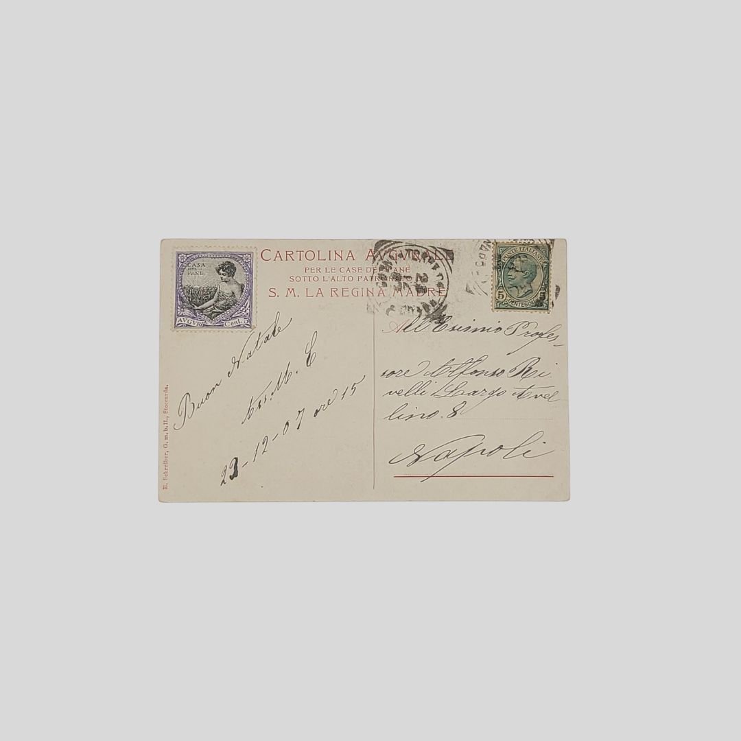 Cartolina augurale d’epoca. Stoccarda, E. Schrelber, G.m.b.H. Viaggiata, datata 23-12-1907, francobolli e timbro, cm 13,8×8,8. Al verso: «Cartolina augurale per le case del pane sotto l’alto patronato di S.M. la Regina Madre». In buone condizioni. Le “Case del Pane” erano istituzioni assistenziali attive in Italia per la distribuzione gratuita del pane, promosse sotto l’alto patronato della Regina Madre Margherita di Savoia. A cavallo tra la fine dell’800 e i primi del ‘900 Giuseppe Sangiorgi, giovane imprenditore, sognava l’istituzione di una rete di case del pane nelle quali si offrisse gratuitamente il pane a chi non aveva la disponibilità economica per acquistarlo. Si costituirono comitati in tutte le città, solo di donne, i più bei nomi dell’aristocrazia e dell’alta borghesia italiana, che vendevano queste cartoline con relativo erinnofilo per raccogliere i fondi. L’immagine al recto raffigura Il Salterello, danza tradizionale diffusa nel centro Italia, probabilmente risalente all’antica Roma. È tratta da un’opera attribuita all’artista francese Antoine Jean-Baptiste Thomas, che documentò la vita popolare a Roma tra il 1817 e il 1818.