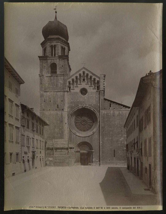 Stampa all'albumina di misure 195x260 mm. Condizioni : USATO - Stato : Buono, ordinari segni d'uso e del tempo. Altre note : La ditta Alinari nel giugno del 1905 realizzò una campagna fotografica a Trento documentando principalmente il Duomo di Trento e il Castello del Buonconsiglio, ma anche palazzi, portali, dipinti della città e Castel Toblino. Le riprese si situano temporalmente poco dopo la fine dei grandi lavori che rinnovarono il volto di Trento: lo stesso Duomo, che venne restaurato nel 1882/3, mostra ancora fresche le tracce di un così radicale intervento. Ogni fotografia porta, oltre all'intestazione della ditta, il numero di registrazione, il luogo e il soggetto. "Il Popolo", quotidiano di Trento diretto da Cesare Battisti (Trento 1875-1916), sul numero del 20 giugno 1905 informò che ".da quasi un mese si trovano fra noi vari addetti al grande stabilimento fotografico Alinari di Firenze per riprodurre le migliori cose d'arte della nostra città .". Oltre a felicitarsi per l'importante iniziativa sull'altro quotidiano locale, l'"Alto Adige", si accenna ad un fatto non secondario in quel tempo di irredentismo: ".l'intraprendenza della casa Alinari che, non curando spese, sta compiendo opera patriottica ed anche veramente artistica.". Chi abbia consigliato Vittorio Alinari (1859-1932) ad organizzare quella campagna fotografica allora oltre confine ed estesa, successivamente, a Trieste e l'Istria, non è dato sapere con esattezza. È ipotizzabile che qualche irredentista ben radicato nell'ambiente fiorentino, forse lo stesso Battisti, abbia caldeggiato questa spedizione."<br>