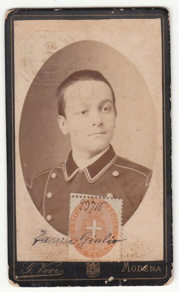 In buone condizioni piccole abrasioni al margine inferiore, cdv con timbro a secco Ministero della Guerra marca da bollo ufficiali in viaggio sulle ferrovie sul retro firma Favro Giulio