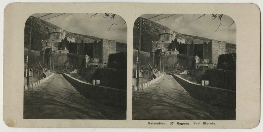 Stampa fotografica alla gelatina di misure 179x88 mm. Condizioni : USATO - Stato : Buono, ordinari segni d'uso e del tempo. Altre note : La fotografia raffigura la fortezza Minceta della città di Ragusa. Al verso timbro del fotografo.