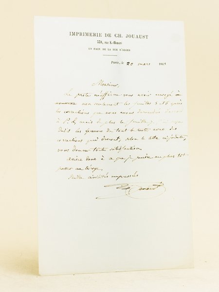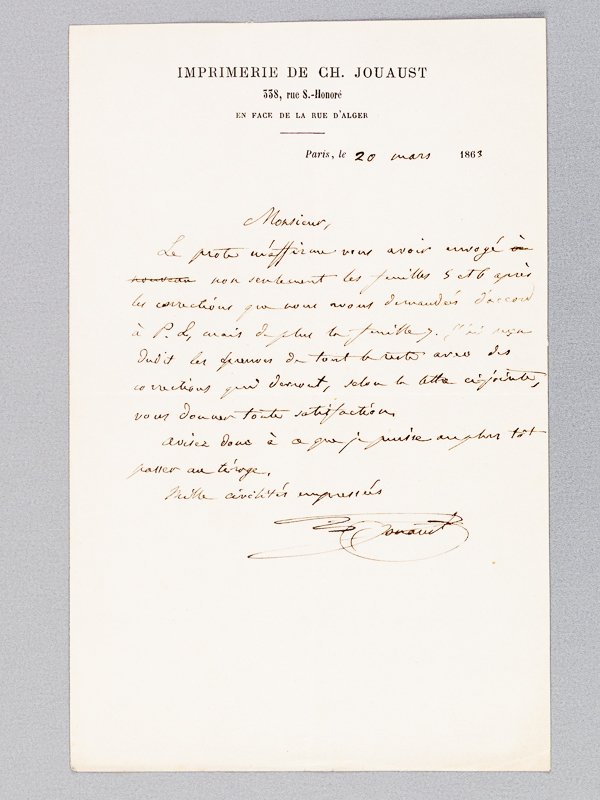 1 billet autographe signé sur papier à en-tête de l'Imprimerie de Ch. Jouaust daté du 20 mars 1863 : "M., le prote m'affirme vous avoir envoyé non seulement les feuilles 5 et 6 après les corrections que nous avons demandées d'accord à P. L., mais de plus la feuille 7. d j'ai reçu dudit l'épreuve de tout le reste avec des corrections qui devront, selon la lettre ci-jointe, vous donnez toute satisfaction. Aviez donc à ce que je puisse plutôt passer au tirage. 1000 civilités empressées."