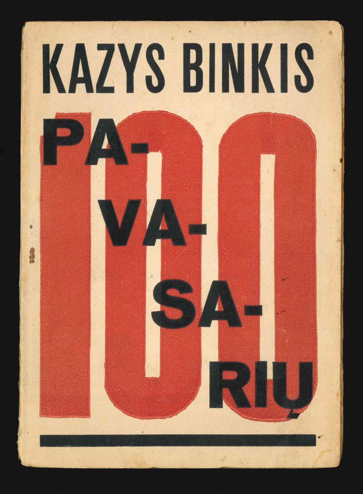 LIBROSecond edition.A very good copy.The founder poetry collection of the Lithuanian futurism in its second edition, with a brand new constructivist cover design (first ed. 1923 wrapped in an early-Russian-futurism-like cover). The author was the founder and leading member of the «Keturi Vėjai» group, and certainly one of the most skilled and interesting poet of the early 20th century Lithuanian literature. «Bene visur akcentuojamas Kazio Binkio poezijos naujumas, kitoniškumas, pabrėžiama, kad eilėraščių rinkinys “100 Pavasarių” (1923, 2-asis leid. 1926) suvaidino ledlaužio vaidmenį lietuvių poetikos raidoje [The not everywhere emphasized novelty and otherness in Kazys Binkis verses, stressed out that the collection of poems “100 Springs” (1923, 2nd ed. 1926) played the role of the icebreaker for the development of Lithuanian poetry]» (E. Darbutaitė, «Vaizduotė ir temperamentas : žaidybos elementai Kazio Binkio poezijoje», in «Darbai ir dienos» 35 (2003), pp. 133-152). Very scarce. No copies in trade or in auctions. Only three institutional holdings in OCLC and KVK, plus the copy of the “Martynas Mažvydas” National Library of Lithuania. Salaris, Futurisms in the World, p. 669