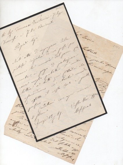 - 2 carte scritte al recto. La lettera datata è scritta su carta listata a lutto.