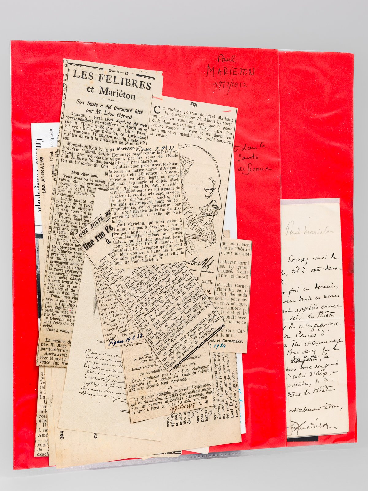 Ensemble de 5 pièces autographes signées, à savoir : 1 L.A.S. du 16 juillet 1900, 9 rue Richepanse : [il répond à propos de M. Speck : ] "Je l'ai vu plusieurs fois ces dernières semaines & j'aurai sans doute eu recours à ses bons offices, ayant apprécié comme il convient sa mise en scène du Théâtre Lyrique. Mais je viens de m'engager avec l'orchestre & les choeurs du Casino d'Aix-les-Bains, où va être incessamment représentée Iphigénie. Vous savez que le chef d'orchestre en est M. Johin, de Monte-Carlo. Je ne puis donc songer à d'autre régisseur qu'à celui d'Aix, sous la direction, bien entendu, de M. Baduel, metteur en scène du théâtre d'Orange" ; [ On joint : ] 1 CDV avec texte autographe signé [adressée à Mounet-Sully selon une mention ms. au crayon ] : "Cher Ami Je suis rentré de chez mes parents. On vous a espéré aux 2 répétitions des Burgraves (Trocadero) hier & aujourd'hui. Elles ont lieu à 4 h1/2 à la suite du Roi Midas. Je sais que vous avez à répéter Hernani au Théâtre Français, de 2 h à 4 chaque jour. Voulez-vous venir ensuite au Trocadéro [. ] ; [ On joint : ] 1 CDV avec texte autographe signé [ Paul Mariéton évoque un courrier à envoyer à Valère Bernard et des détails sur les "scission" ] ; [ On joint : ] 1 L.A.S. [Paul Mariéton demande de publier une notule pour signaler un jeune artiste de vrai talent ] ; [ On joint : ] 1 CDV avec texte autographe signé ; [ On joint : ] Recueil de coupures de presse relatives à Paul Mariéton Intéressant lot de documents autographes et de coupures de presses témoignant du travailleur inlassable qu'était Paul Mariéton (1862-1911). Félibre et confident de Frédéric Mistral, Paul Mariéton fut aussi responsable des "Chorégies d'Orange" dont il évoque le metteur en scène dans sa première lettre.