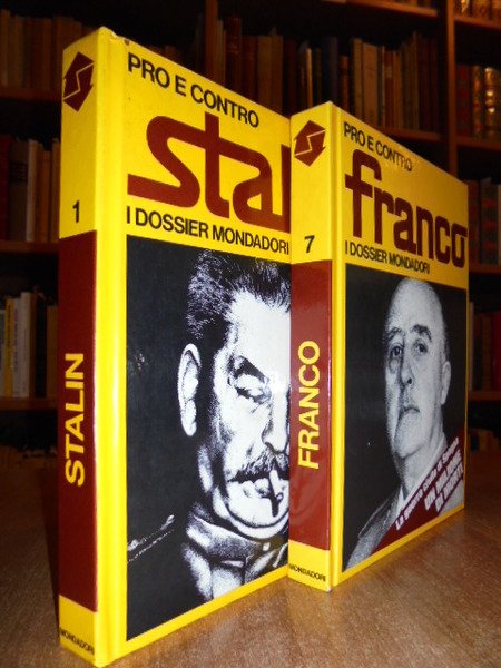 I dossier Mondadori. Milano, Mondadori, 1971-72. 2 Volumi. Pro e contro Stalin. Pro e contro Franco. A cura di Marisa Paltrinieri e Gianni Rizzoni. 2 volumi in-8°, cartonato edit. 159 pp.; 159 pp. con illustrazioni in nero anche a piena pagina. Stampati su carta gialla. Ben conservati. Neg. mob. storia.