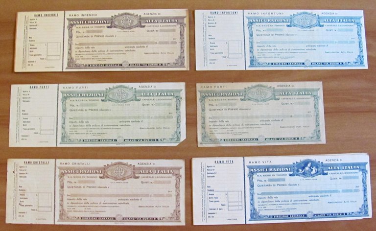 Quietanze assicurative Assicurazioni  Alta Italia Sede in Torino. Varie quietanze così suddivise: 11 Ramo Incendio; 1 Ramo Cristalli; 1 Ramo Infortuni; 2 Ramo Furti (di cui una senza talloncino); 9 Ramo Vita. Rare e in Ottimo stato. , Ottimo (Fine)