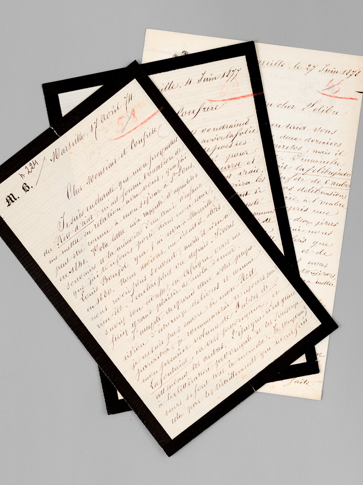 3 L.A.S. adressées à Melchior Barthès, à savoir : 1 L.A.S. de 2 pages datée de Marseille le 17 avril 1874 : [ Marius Bourrely se réjouit d'être rentré en contact avec son confère, "que j'ai peut-être connu à mon séjour à St Pons en 1841. Votre lettre m'a rappelé d'agréables souvenirs et la mémoire d'un ami d'enfance que j'ai toujours porté dans mon coeur, Louis Boujol ] "J'accepte de grand coeur votre proposition d'échange de livres [. ] je commencerai toujours par mon premier volume de "Fables de La Fontaine", en vers provençaux, en attendant les autres. L'époque n'est guère à la littérature provençale et les souscripteurs se font tirer la manche. Je comprends cela par les tiraillements que nous fait éprouver la politique de nos gouvernants et jusqu'à ce que le problème de monarchie ou de République soit résolu, il en sera ainsi. Il faut avouer que nous sommes un singulier peuple et que la France une nation bien étrange. Votre qualité de Membre de la Société Archéologique de Béziers ne vous amènerait-elle pas dans cette ville, le 14 du mois prochain ? [ . ] Je rêve aussi de revoir St Pons [ . ] Excusez-moi si je ne vous ai pas répondu plus vite, mais j'étais en train d'achever les Fables de Florian, en provençal toujours, et mon oeuvre achevéen je vous au écrit" [.] ; [ On joint : ] 1 L.A.S. de 3 pages datée de Marseille le 4 juin 1877 : "Cher confrère, Beaucoup de gens voudraient pouvoir, comme vous, avoir la folie de publier un volume de poésies néo-romanes ; mais hélas ! pour beaucoup la fable du Renard et des raisins sera éternellement vraie. Ensuite ce volume vous ouvrira les portes du Majorat et qui sait si un jour vous ne serez pas appelé à occuper mon fauteuil ! Nous sommes tous mortels et je serai flatté de savoir ma Cigale d'Or passer dema boutonnière à celle de mon confrère érudit [il évoque ensuite la réclame qu'il fera pour lui, cite trois vers en provençal, évoque un M. Bizet de la gare de Cette, parle de sa brochure "Cigau e Cigalo" et conclut sur son homonyme Victor Bourrelly, de Rousset. ] ; [ On joint : ] 1 L.A.S. de 3 pages datée de Marseille le 27 juin 1878 : "Mon Cher Felibu, Je viens un peu tard vous accuser réception des deux derniers exemplaires des Flouretos ; mais il n'y a pas de ma faute [ cela en raison de la fête félibréenne qu'il détaille ] "Je vous ai adressé samedi Jan de La Valado" [. ] "J'ai propagé votre oeuvre dimanche, mais nos félibres marseillais ne sont pas languedociens et leur enthousiasme poétique ne dépasse pas Avignon. Mon dernier mot n'est pas dit, et je ne désespère par encore de vous trouver quelques adhérents dans nos contrées. J'accepte de bonne part les observations que vous me faites au sujet des Contes de La Fontaine, et je m'y attendais à l'avance ; aussi vous disais-je que cet ouvrage n'était pas destiné à la publicité. J'aurais pu employer mieux mon temps dites-vous. On ne peut pas faire toujours des oeuvres sérieuses et l'esprit a besoin, souvent, de se retremper dans la gaudriole pour reprendre son élan et s'élever dans les sphères plus hautes. Ma Muse est très inconstante et quand elle trouve des obstacles, elle aime à les franchir [ . ] Que penserez-vous quand je vous dirai que j'ai entamé l'Orland Furioso de l'Arioste, un poème en 46 chants, toujours en provençal ? [etc. ] 3 très belles lettres autographes signées adressées par l'écrivain d'expression provençale et majoral du Félibre Marius Bourrely (1820-1896) à son confrère le poète occitan de Pons-de-Thomières, Melchior Barthès (1818-1886). Ces lettres sont d'autant plus remarquables que Marius Bourrely fut le préfacier des "Flouretos" de Berthet, et qu'il s'y exprime sur les difficultés rencontrées dans la publication de la littérature occitane, et s'y justifie de sa traduction en provençal des "Contes" de La Fontaine.