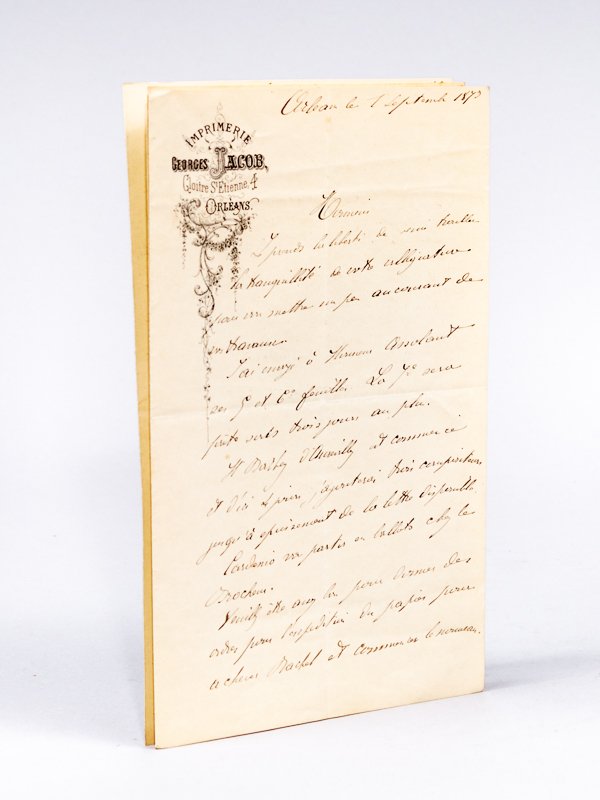 3 Lettres autographes signées sur papier à en-tête de l'Imprimerie Georges Jacob, Cloître St-Etienne, Orléans [ Adressées à Edouard Dentu, évoquant le travail d'impression d'un ouvrage de Barbey d'Aurevilly, très vraisemblablement l'édition originale des Diaboliques : ] - Première L.A.S. : " Orléans le 27 août 1873. Monsieur, je vous adresse le spécimen pour le volume de M. d'Aurevilly. Il y a énormément de matières : le spécimen est encore neuf sur une justification assez large comme vous le voyez, interligne à deux points, et nous formerons 10 feuilles pleines à 10 feuilles 1/2. Il faudra évidemment un faux titre pour chaque partie. Le caractère sera très bon, très net. Mais la quantité de matière et le nombre limité de feuilles nous