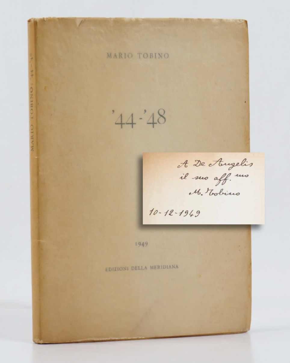 LIBRO Prima edizione. CON AUTOGRAFO. Esemplare 144 di 300 numerati, ben completo del pergamino protettivo, in ottime condizioni (minimi strappi marginali non deturpanti al pergamino, leggera brunitura uniforme alla legatura e alle carte). Dedica autografa dell’autore datata 10 dicembre 1949: «A De Angelis il suo aff.mo M. Tobino - 10 - 12 - 1949». Scritte a matita leggera sul pergamino. Raccolta di versi stampata, secondo le consuetudini delle edizioni della Meridiana, in 321 copie nel formato tascabile («in 32°» secondo la peculiare classificazione interna), di cui 300 numerate da 1 a 300 e le restanti 21 da A a Z su carta uso mano. Raccoglie le poesie scritte durante la guerra.
