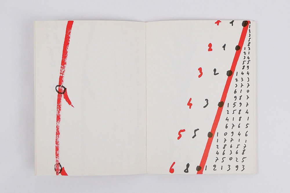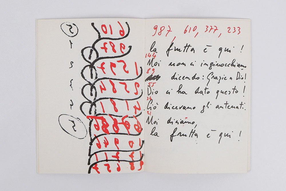 LIBROPrima edizione.Esemplare non numerato di una tiratura dichiarata di 987 esemplari numerati, in ottime condizioni. Scritte a matita all’ultima carta.Libro d’artista caotico, bizzarro, quasi delirante nei suoi testi in cui la frutta domina la scena: «La frutta è qui! Noi non ci inginocchiamo dicendo grazie a Dio! Dio ci ha dato questo! Ciò dicevano gli antenati. Noi diciamo la frutta è qui ma non sappiamo da dove venga. Noi non sappiamo perché la frutta è qui! Pensiamo che la frutta sia di nostra proprietà, poi abbiamo dei forti sospetti, forse la proprietà di mangiare la frutta è proprio nostra ma che la frutta sia nostra non sappiamo come sia. I banchi della frutta sono grandiosi [.] La frutta è bellissima!». Ad accompagnare le parole, numeri e linee neri e rossi, spirali ascendenti che ricordano torri o alberi e poi linee morbide interrotte da punti da cui di nuovo nascono numeri, linee e parole.