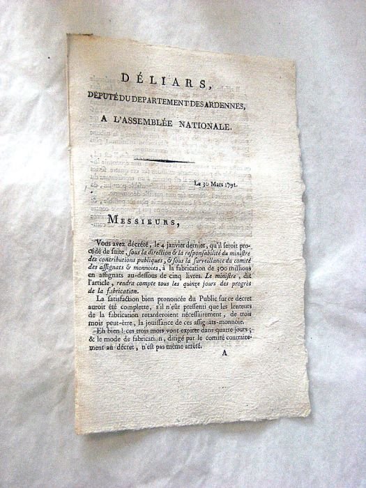 in-8. 2pp. Broché. Non rogné. Légères rousseurs. Sur le retard d'émission des assignats. L'auteur demande la permission de présenter un mode de fabrication de son invention qui serait bien plus rapide et économique. Économie. Finance. Monnaie.