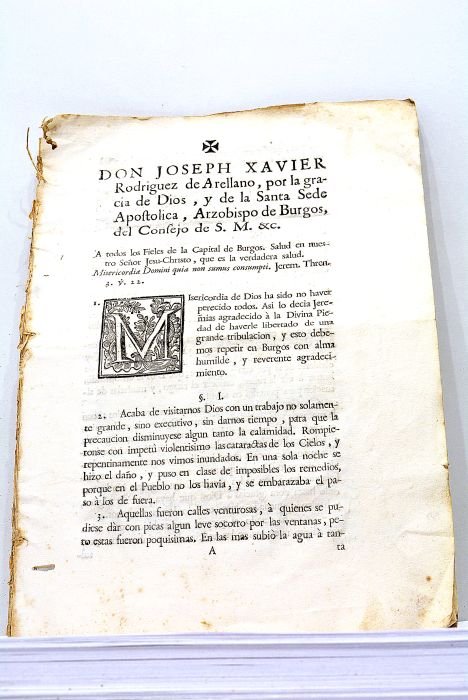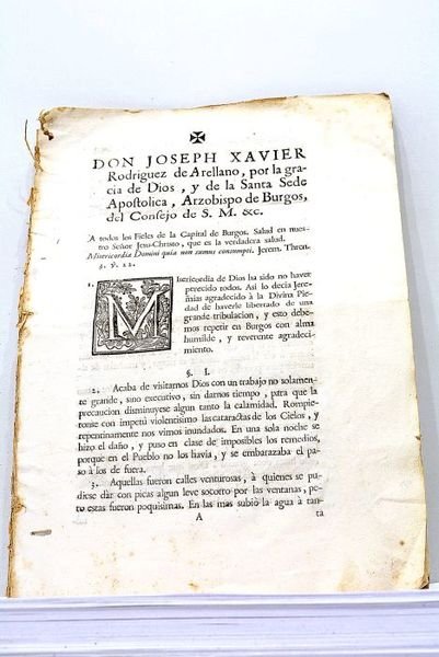 in-folio. 23pp. Broché. Petits trous de vers dans la marge intérieure. Quelques salissures. Petites mouillures dans les marges. Traces de plis. Sermon réalisé par l'archevêque de Burgos à l'occasion de violentes inondations qui provoquèrent de nombreux dégâts dans cette ville. Il explique cette catastrophe comme un signe de la colère et bonté divines. España. Castilla y León.