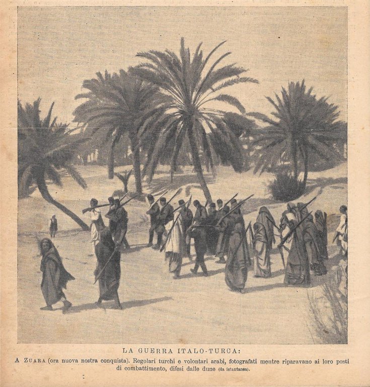 A Zuara. Regolari turchi e volontari arabi mentre riparavano ai..... Stampa 1912