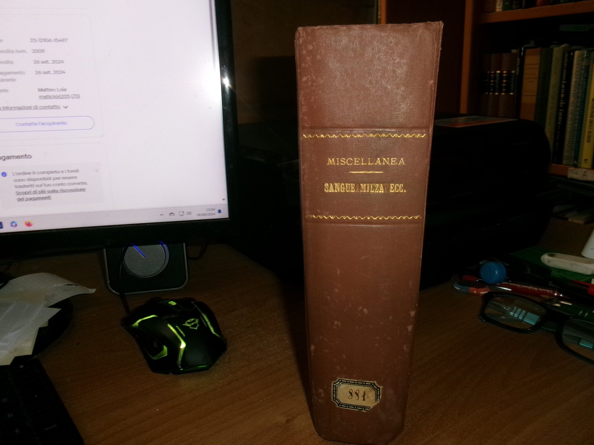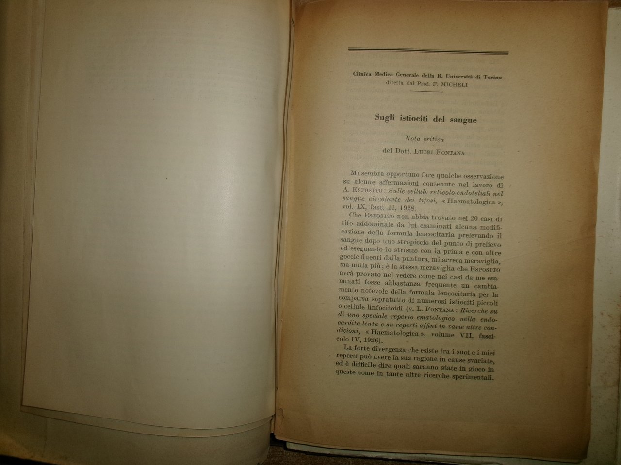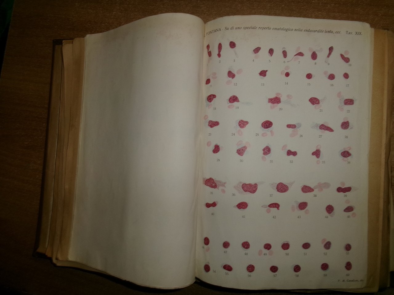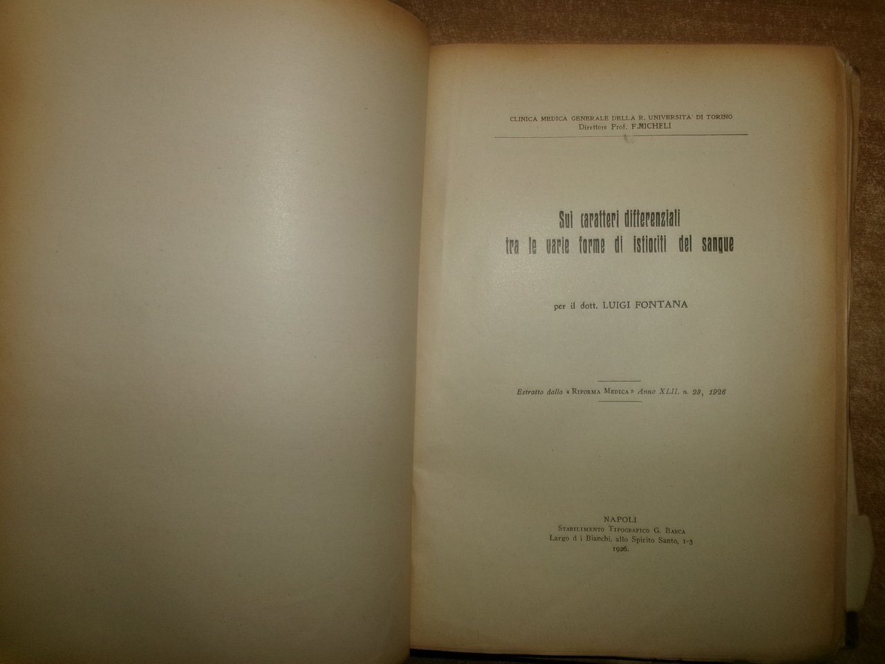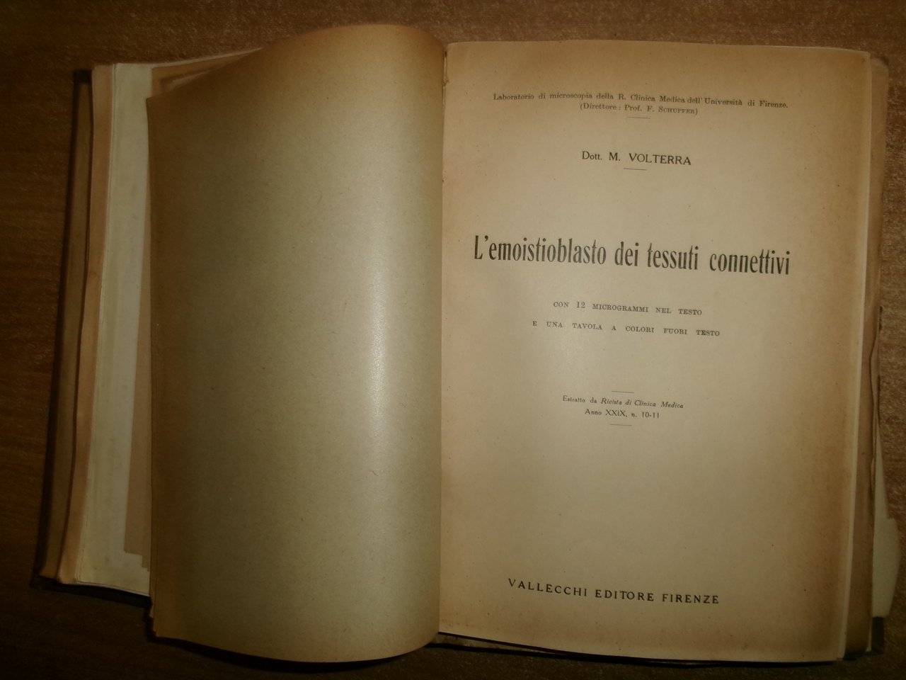 AA. VV. MISCELLANEA di numerosi estratti/opuscoli riguardanti il sangue, milza ecc. Raccolta di numerosi opuscoli/estratti con varie date (dal 1916 in poi) rilegati in un volume in-8°, m-tela con titolo in oro sul dorso e con numerose illustrazioni anche a colori. Le pagine 45-46-47-48-49 dell' opuscolo Dott. Volterra sono tagliate in parte del testo. E' presente un estratto del 1923 (HAEMATOLOGIA) del Dott. Patella Vincenzo di 71 pp. inserito del volume attinente all' argomento della raccolta. Buono stato di conservazione con la maggior parte del testo in italiano (alcuni in tedesco). Uff. salon. sporta 9