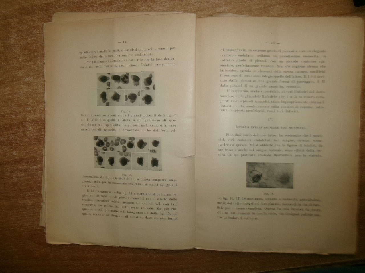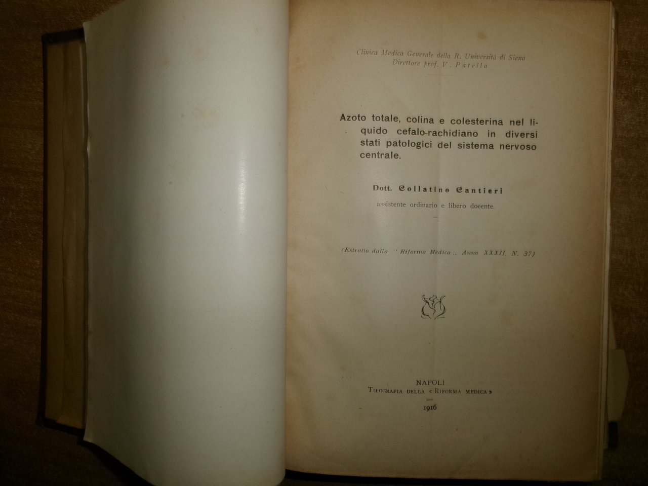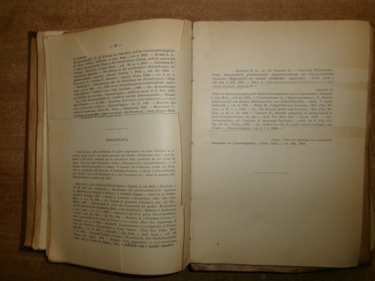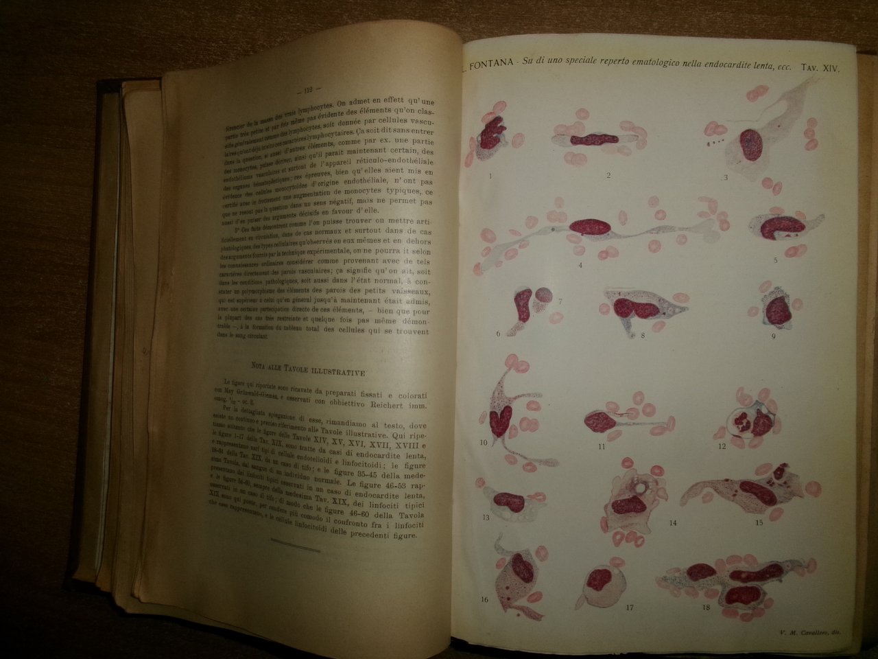 AA. VV. MISCELLANEA di numerosi estratti/opuscoli riguardanti il sangue, milza ecc. Raccolta di numerosi opuscoli/estratti con varie date (dal 1916 in poi) rilegati in un volume in-8°, m-tela con titolo in oro sul dorso e con numerose illustrazioni anche a colori. Le pagine 45-46-47-48-49 dell' opuscolo Dott. Volterra sono tagliate in parte del testo. E' presente un estratto del 1923 (HAEMATOLOGIA) del Dott. Patella Vincenzo di 71 pp. inserito del volume attinente all' argomento della raccolta. Buono stato di conservazione con la maggior parte del testo in italiano (alcuni in tedesco). Uff. salon. sporta 9
