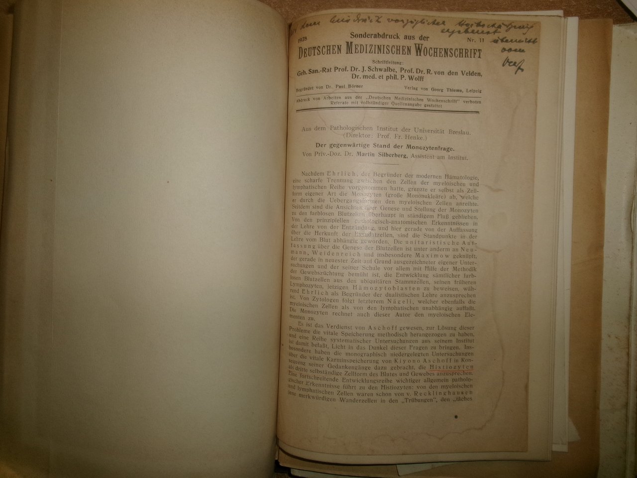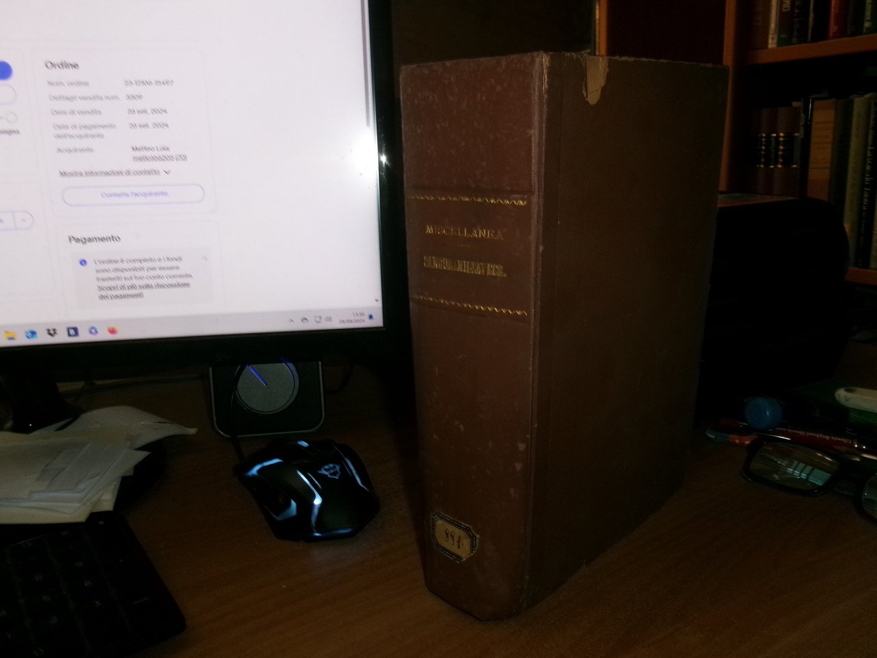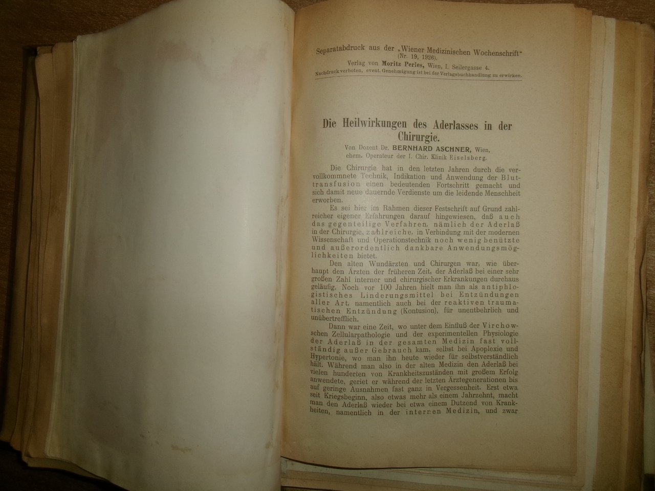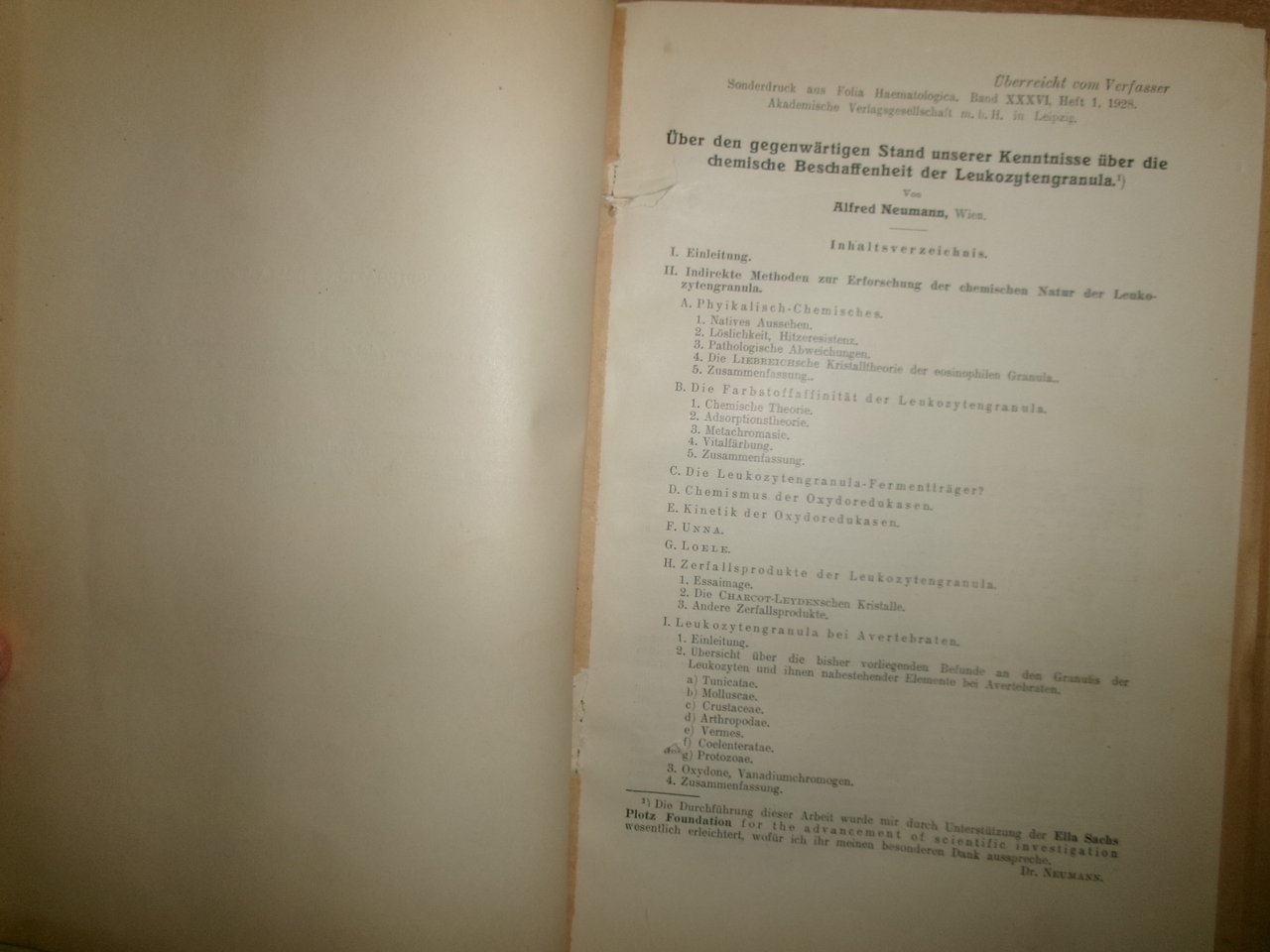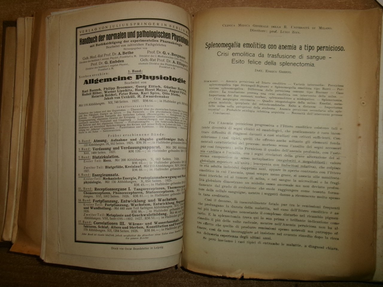 AA. VV. MISCELLANEA di numerosi estratti/opuscoli riguardanti il sangue, milza ecc. Raccolta di numerosi opuscoli/estratti con varie date (dal 1916 in poi) rilegati in un volume in-8°, m-tela con titolo in oro sul dorso e con numerose illustrazioni anche a colori. Le pagine 45-46-47-48-49 dell' opuscolo Dott. Volterra sono tagliate in parte del testo. E' presente un estratto del 1923 (HAEMATOLOGIA) del Dott. Patella Vincenzo di 71 pp. inserito del volume attinente all' argomento della raccolta. Buono stato di conservazione con la maggior parte del testo in italiano (alcuni in tedesco). Uff. salon. sporta 9