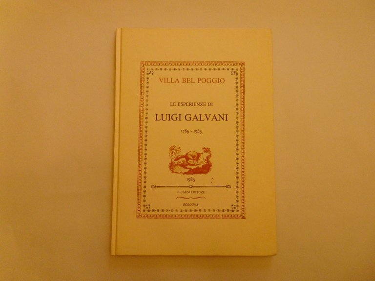 AA VV, Villa Bel Poggio Le Esperienze Di Luigi Galvani 1786 - 1986 Li Causi Editore, Bologna, 1986; cm. 27,5x19,5; pp. 53 + indice; ill. fotog. n. t. a col.; cartonato edit. fig. a col. Condizioni di conservazione Esemplare in ottime condizioni di conservazione. Lievi abrasioni e pieghe agli angoli della coperta. Appunti manoscritti con trascrizioni a fianco. Ediz. numerata di esemplari 999. Nostro esemp. n° 548. SETT16.L17951G