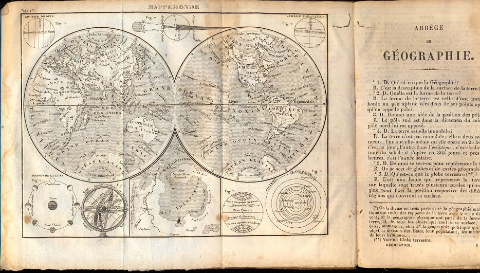 In 16°, p. pelle, pp. 220 + 6 carte geografiche, più volte ripiegate, raffiguranti: l'Europa, Mappamondo, la Francia, l'Asia, l'Africa e l'America. Gore. Mende alla cop.