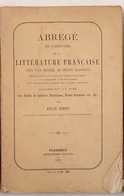 Edizione del 1875 di questo riassunto di storia di letteratura francese scritta da Felice Sodini. Siamo in possesso del volume per gli alunni del secondo e terzo anno delle scuole normalie tecniche. La storia dal medioevo alla prima metà del XIX secolo. Segue raccolta di testi classici in poesia e prosa. In buone condizioni. Copertina editoriale in buone condizioni generali con lievi usure ai margini e dorso. Legatura in buone condizioni. All'interno le pagine si presentano in ottime condizioni con rare fioriture. In 8. Dim. 19x12,5 cm. Pp. IV+71+(1)+IV+58. Edition of 1875 of this resuming of history of french litterature written by Felice Sodini. Unfortunately we only have the volume for students of the second and third year . The history from Middle Age to the first half of XIX century. Then collection of classical texts in poem and prose. In good conditions. Editorial cover in good general conditions lighlty worn in the extremities. Binding in good conditions. Inside pages are in very good conditions. with occasional foxings In 8. Dim. 19x12,5 cm. Pp. IV+71+(1)+IV+58.