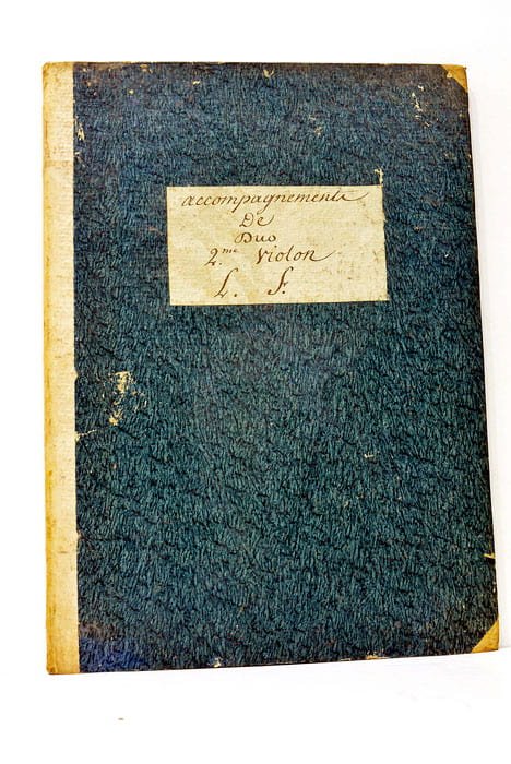 1 feuillet blanc. 8 feuillets. 3 pages. + 3 pages. + 3 pages. 2 feuillets. 3 pages. + 3 pages. + 3 pages. + 5 pages. 1 feuillets blanc. (35,5x25,5 Cm). Demi-vélin à coins. Etiquette de titre collée sur le premier plat. Traces de vers sur le deuxième plat. Dégât d'humidité. Plats frottés. Partitions de musique. Mouillures.
