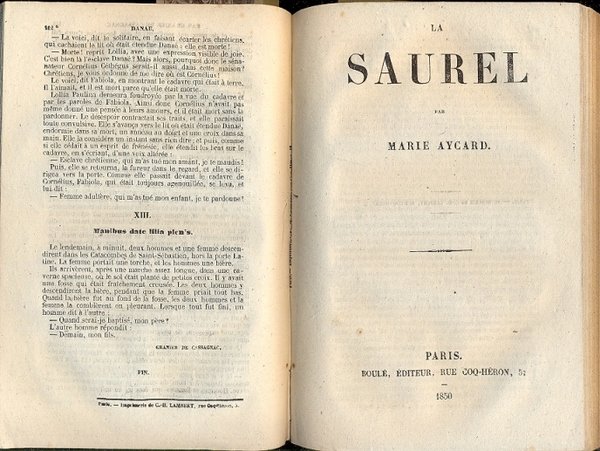 In 8°, m. tela no coeva, pp. 107 + 31 + 112 + 167 + 8. Cinque scritti tratti dai Supplementi del giornale "L'Estafette" del 1850 come si legge sulla prima pag. del racconto scritto da Karr.