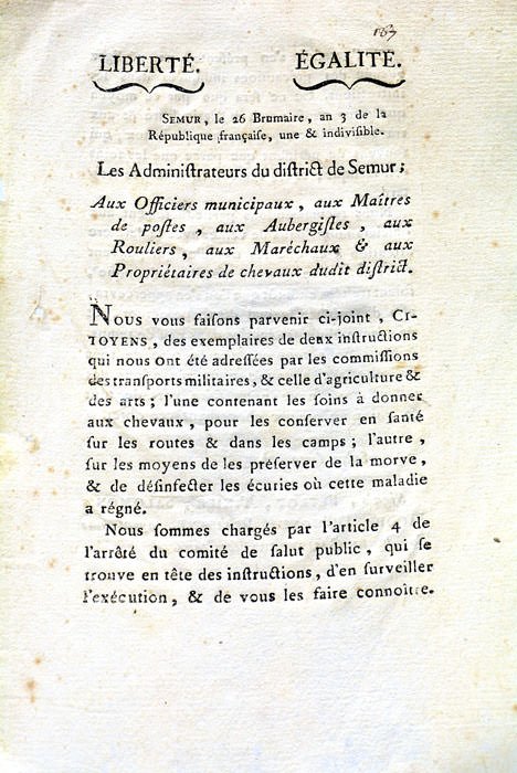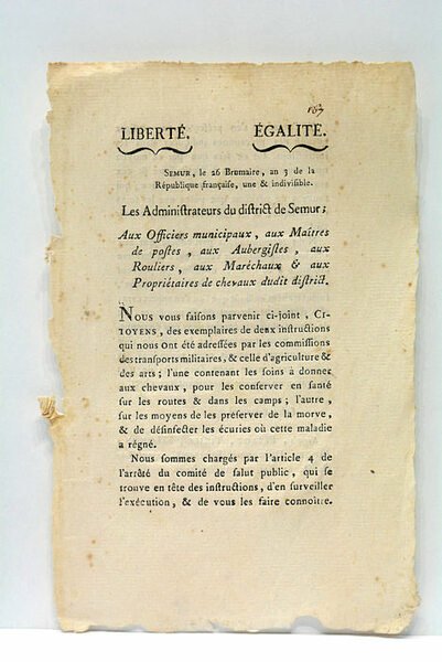 2 pages. (21x13 Cm). Broché. Petites déchirures et rousseurs sans gravité. Les administrateurs de Semur annoncent la diffusion de 2 instructions officielles sur les moyens de conserver en bonne santé les chevaux. Document en bon état.