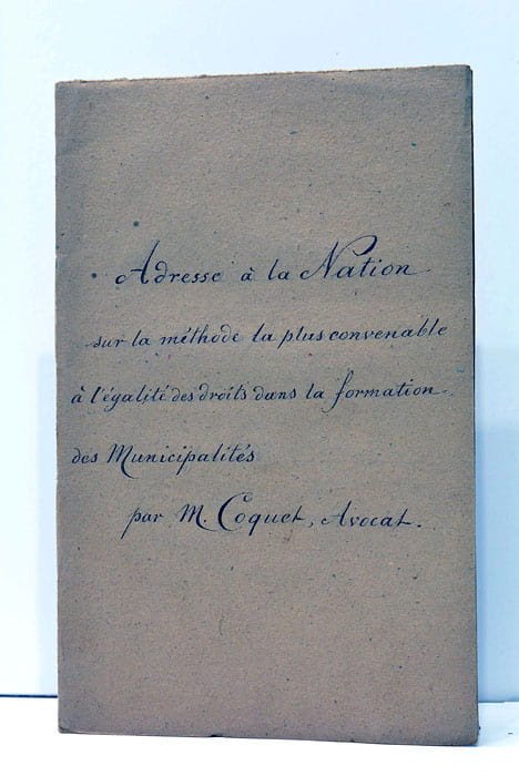 1 feuillet. 16 pages. (19,5x12,5 Cm) Broché. Couverture postèrieure. Titre et auteur manuscrit. Ce texte s'inscrit dans le contexte révolutionnaire français, alors que de nouvelles structures administratives et politiques, notamment les municipalités, étaient établies pour favoriser une gouvernance locale démocratique. Ce document propose des réflexions et des recommandations sur la mise en œuvre de l'égalité des droits dans l'organisation municipale. Il est probablement influencé par les décrets de décembre 1789 sur la constitution des municipalités, qui structuraient les communes avec des conseils municipaux et des conseils généraux composés de citoyens actifs et de notables, élus pour représenter les intérêts locaux. Ces réformes visaient à uniformiser la gestion des communes tout en garantissant une certaine représentativité démocratique, bien que les critères de citoyenneté active excluaient une partie importante de la population (comme les femmes et les citoyens passifs) des processus électoraux.Le texte de M. Coquet aurait pu répondre aux débats sur la centralisation du pouvoir, la participation citoyenne, et les tensions entre traditions locales et nouvelles institutions républicaines. À Marseille, où Monsieur Coquet était avocat à l'époque, ville portuaire et centre commercial de premier plan, les discussions autour des municipalités étaient particulièrement importantes en raison de sa diversité sociale et économique. Broché très bien conservé.