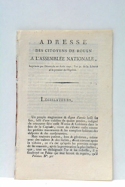 ADRESSE DES CITOYENS DE ROUEN À L'ASSEMBLÉE NATIONALE, imprimée par décret du 20 août, l'an 4e de la Liberté et le premier de l'Egalité.