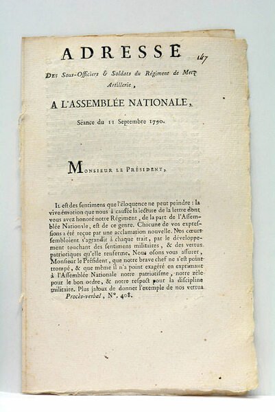3 pages. (21x14 Cm). Broché. Non rogné. Les soldats de Metz y clament leur fidélité et leur soutien inconditionnel à l'Assemblée Nationale. Broché en bon état.