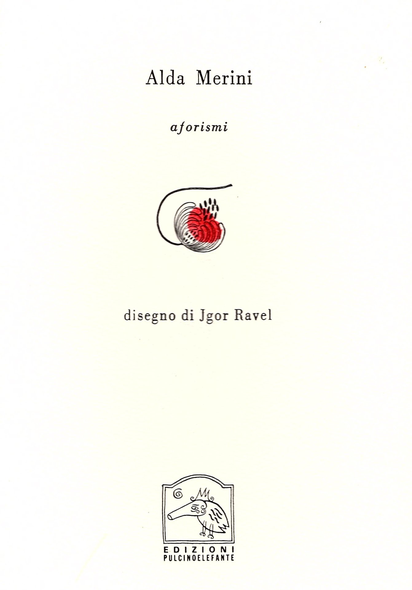 In-8°, pp. 2, brossura editoriale figurata.Un disegno di Jgor Ravel f.t. inciso su legno. Perfetto stato. Edizione originale, tirata a soli 33 esemplari. Edizione n. 4539 della 'Pulcinoelefante', casa editrice le cui singolari plaquettes sono sempre state caratterizzate dalla bassissima tiratura. Manca al Gambetti / Vezzosi.