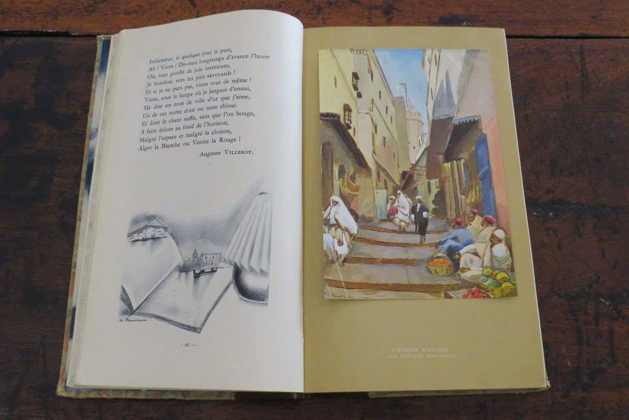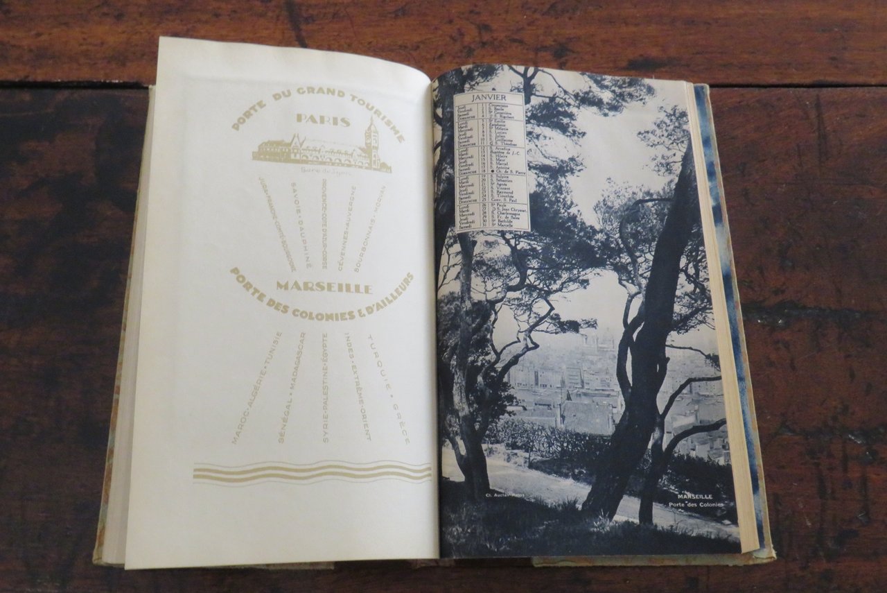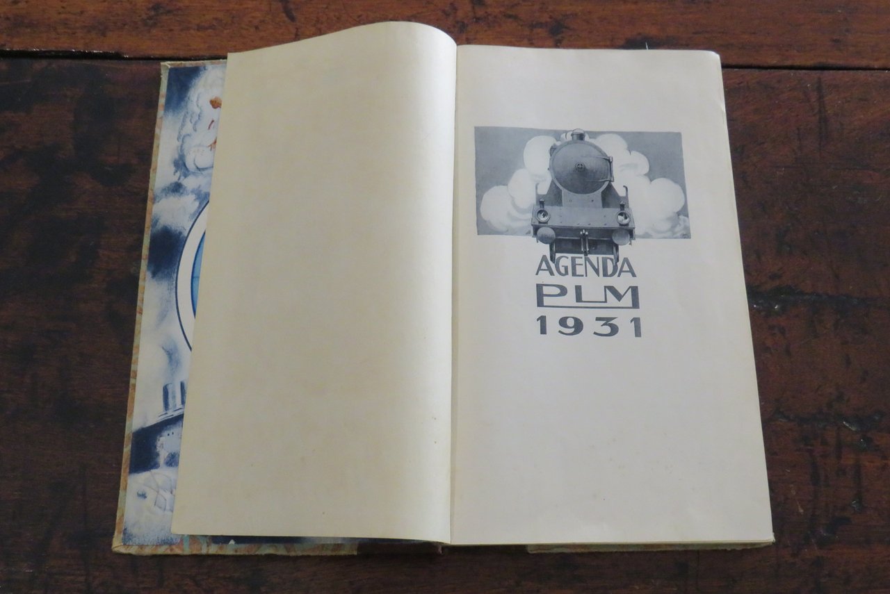 Paris, Compagnie des Chemins de fer Paris-Lyon-Méditerranée, J. Barreau & C., s.d. [ma 1930]. In -4 (mm. 170x290,5), pp. 304. Agenda, Guida, Album de la Compagnie des Chemins de fer Paris-Lyon-Méditerranée, riccamente illustrato da numerose illustrazioni in nero e a colori, disegni, fotografie in bianco e nero e 16 splendide tavole illustrate nel testo, con riproduzioni ad acquerello, applicate su cartoncino (fra cui, ad esempio, "Place de la Concorde", Paris, Jule Janein; "Casbah d’Alger", Etienne Bouchaud). Legatura editoriale mezza tela, con piatti ornati da un motivo in carta a colori, con titolo in oro al dorso. Sguardie illustrate al piatto anteriore e posteriore. All’interno: testi di diversi autori. Le Agende del PLM furono pubblicate dal 1911 al 1931. Prima di questa data l’Album delle Guide della Compagnie des Chemins de fer PLM apparve nel 1889. Alla fine del volume l’Agenda si presenta vuota, suddivisa nei corrispettivi mesi e giorni. Al piatto anteriore della legatura, in corrispondenza delle sguardie, dorso allentato, ma nell’insieme ottimo esemplare.