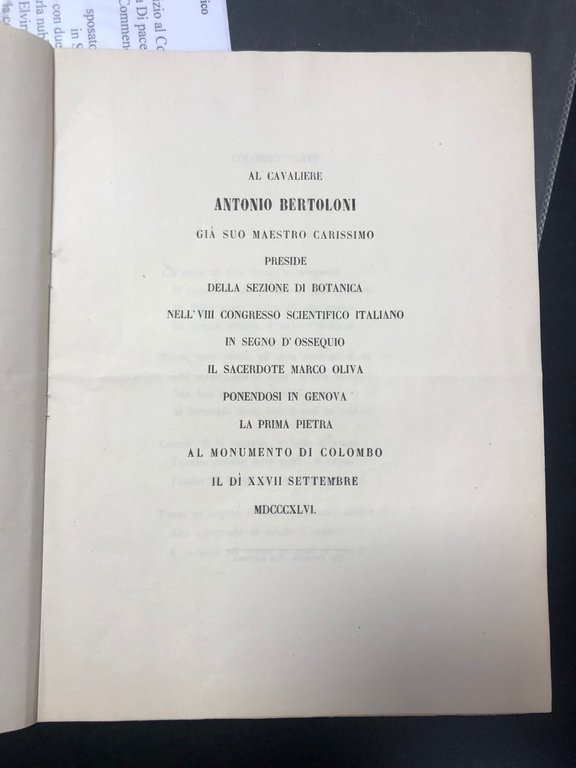 AL CAVALIERE ANTONIO BERTOLONI GIA' SUO MAESTRO CARISSIMO PRESIDE DELLA SEZIONE DI BOTANICA NEL'VIII CONGRESSO SCIENTIFICO ITALIANO IN SEGNO D'OSSEQUIO IL SACERDOTE MARCO OLIVA PONENDOSI IN GENOVA LA PRIMA PIETRA AL MONUMENTO DI COLOMBO IL DI' XXVII