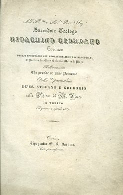 Al. Sacerdote. Gioachino Giordano Torinese. e prefetto del clero di Santa Maria di Piazza nell'occasione che prende solenne possesso della parrocchia de'SS. Stefano e Gregorio nella Chiesa di S. Rocco in Torino il giorno 2 aprile 1837