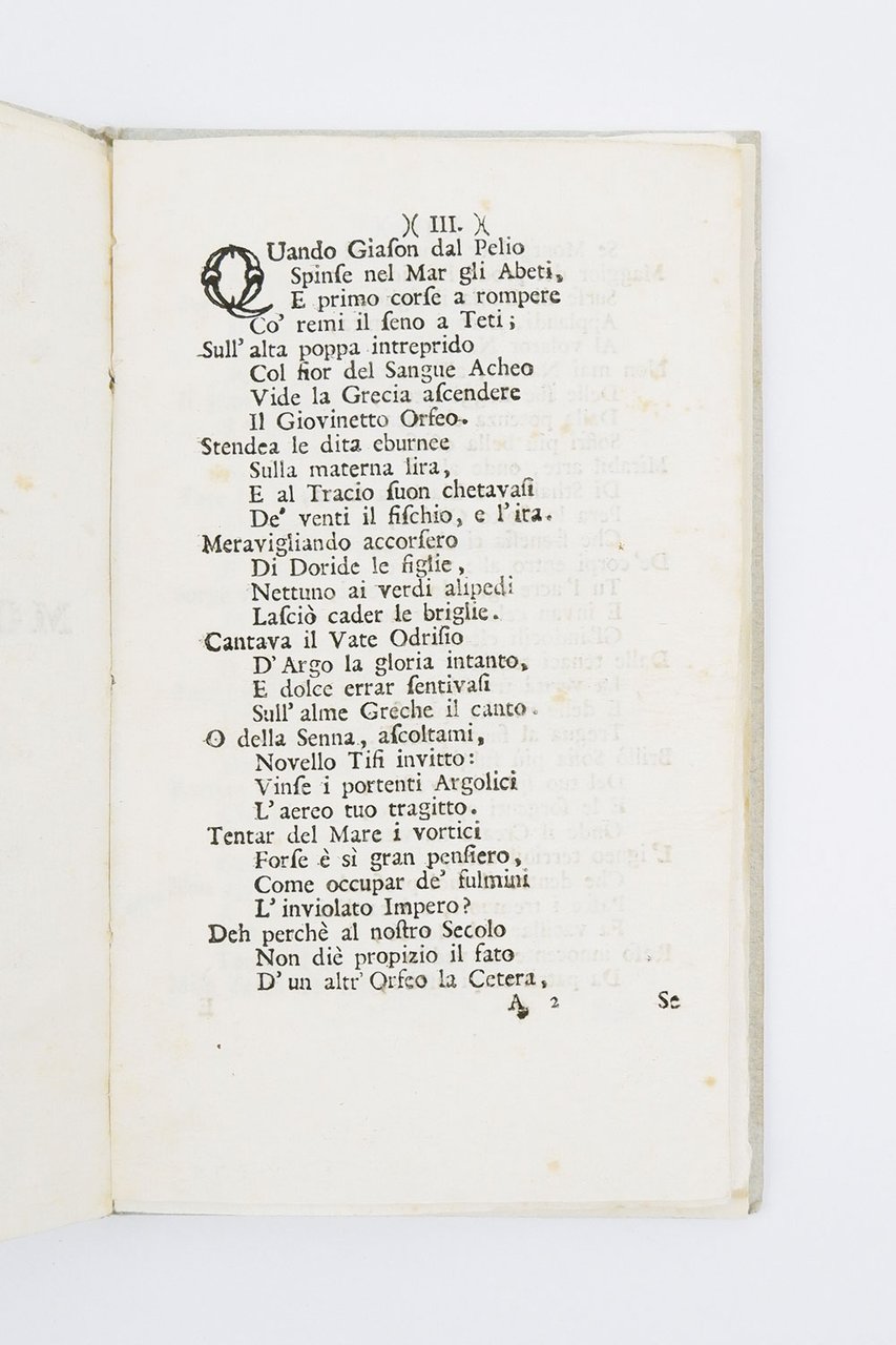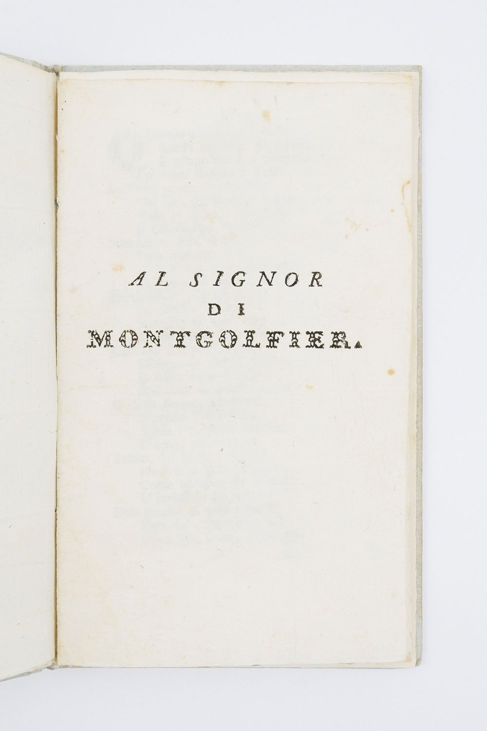 LIBRORarissima edizione: il presente è l'unico esemplare conosciuto.Ottimo esemplare (sporadico e leggero foxing passim), a buoni margini.Il 5 giugno 1783, ad Annonay, i fratelli Montgolfier riuscirono a far sollevare in aria un grande pallone aerostatico ad aria calda, costruito con tela e carta. Nella stessa estate l'esperimento fu ripetuto con alcuni animali a bordo e finalmente, il 21 novembre dello stesso anno, Pilâtre de Rozier e il marchese D'Arlandes percorsero sulla mongolfiera una decina di chilometri, attraversando Parigi a 100 metri di altezza. L'uomo era finalmente in grado di volare. -- La notizia si diffuse rapidamente in tutta Europa, suscitando grande entusiasmo: «Le plebi deliravano a quello spettacolo e, passata la prima impressione, nei seminarii, nelle scuole e nelle accademie non d'altro si parlava e si verseggiava se non de' globi aereostatici» (L. Vicchi, «Nuovo saggio del libro intitolato: Vincenzo Monti, le lettere e la politica in Italia dal 1750 al 1830», Faenza - Fusignano, Stabilimento P. Conti - da Edoardo Morandi, 1883, p. 228). E anche Monti fu travolto dal fascino suscitato dalla scoperta: «A Roma la notizia era arrivata sei buoni mesi dopo la famosa ascensione di Robert e Charles [Montgolfier]. Ma era una notizia sempre fresca; e del resto, quale argomento più adatto per un poeta così innamorato del portentoso come il Monti?» (Monti, «Opere», a c. di M. Valgimigli e C. Muscetta, Milano - Napoli, Riccardo Ricciardi Editore, p. XXV). -- E così nel febbraio del 1784 il poeta celebrò l'impresa componendo l'ode «Al signor di Montgolfier». Dopo averla recitata in Arcadia il 4 marzo, con grande plauso dei presenti, Monti si affrettò a darla alle stampe, pubblicandola il 6 marzo sul romano «Giornale delle belle arti e della incisione antiquaria, musica, e poesia».-- Il successo fu immediato: da nord a sud l'opera fu stampata più volte in forma autonoma, verosimilmente con luoghi di stampa fittizi, e ricordiamo qui le edizioni ad oggi note (indichiamo anche le sedi di conservazione, secondo il catalogo Opac Sbn): «Al signore di Montgolfier», In Parigi ed in Fuligno, presso Gio. Tomassini (una copia presso la Biblioteca e Musei Oliveriani, Pesaro); «Al signore di Montgolfier», In Parigi, presso Barrois libraro nella strada degli Agostiniani (7 esemplari: Biblioteca nazionale Vittorio Emanuele III, Napoli, 2 copie; Biblioteca comunale Augusta, Perugia; Biblioteca Universitaria, Pisa; Biblioteca comunale Classense, Ravenna, 2 copie; Biblioteca Norberto Bobbio dell'Università degli Studi di Torino; «Il pallone volante. Canzone», in Roma, ed in Bologna, nella Stamperia della Colomba; una copia presso la biblioteca trivulziana; «Sopra i palloni volanti poesie», in Mantova, nella stamperia di Giuseppe Braglia (contiene anche i sonetti «La macchina aerostatica» di Parini e «Al signore d. Paolo Andreani tolto alla vita di tutti nel suo volo» di Bettinelli); una copia presso la Biblioteca comunale Ariostea - Ferrara. -- Del tutto ignota, assente dall'Opac nazionale, dai repertori e dagli studi, risulta l'edizione veneziana che qui presentiamo (ne daremo notizia, con l'edizione e la collazione testuale, anche in un articolo di prossima pubblicazione). In assenza di riscontri diretti o riferimenti nell'epistolario montiano, non è ad oggi possibile stabilire una cronologia delle edizioni per determinare quale sia la prima stampata in forma autonoma. Il grande successo dell'ode avrà verosimilmente spinto alcuni editori a cavalcare l'onda e a stamparla a strettissimo giro dall'uscita sul «Giornale delle belle arti». -- Quel che è certa è l'estrema rarità dell'edizione veneziana, ritrovamento di grande importanza anche nell'ottica di una corretta valutazione della ricezione montiana nella penisola.