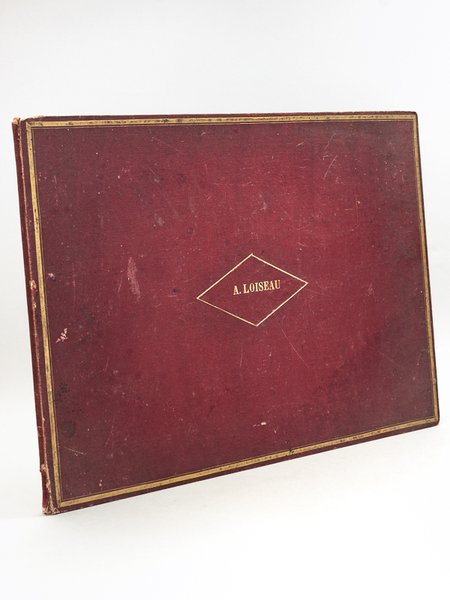 1 album in-folio oblong pleine percaline rouge, avec les 2 premiers feuillets ornementés (motifs floraux) et peints (Titre et "Hommage à mes bons parents"), avec 16 ff. de dessins (motifs géométriques, vues d'architecture) s.d. (circa 1880) Etat très satisfaisant (rel. un peu frottée) pour cet album de dessin établi avec soin par un élève, qui en a fait l'hommage à ses "bons parents".