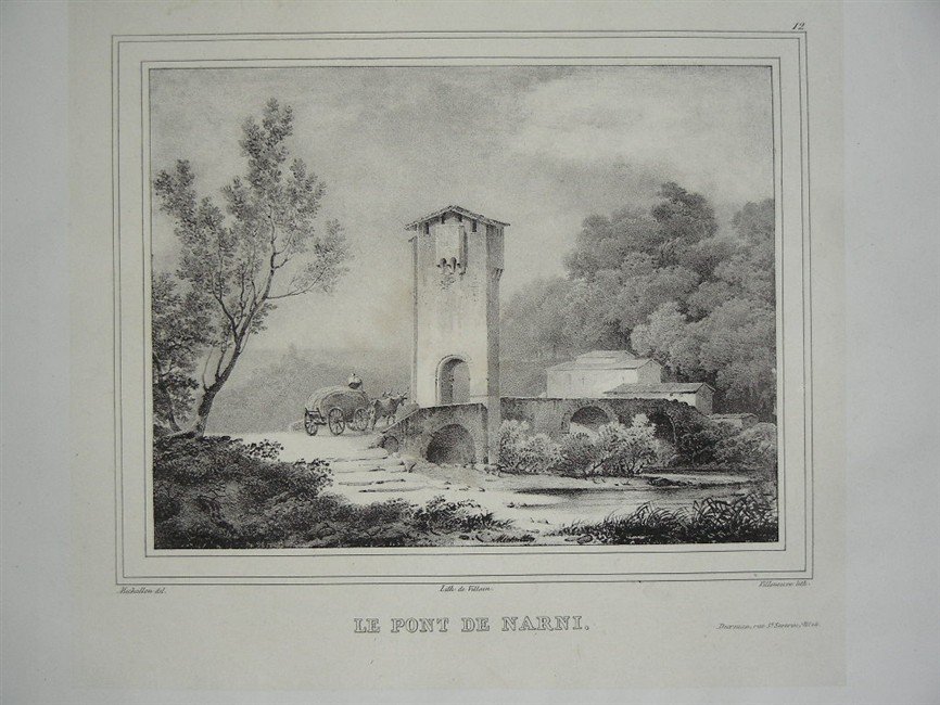 album in folio (mm.460x325), leg. mod. m. perg. con angoli, cart. dec. ai piatti e tass. al d. Raccolta di 19 vedute di paesaggi italiani in litografia, disegnate da Michallon e Remond, e rappresentano: Castellamare, Sorrento, vicinanze di Napoli, Tivoli, Narni, vicinanze di Roma, Ariccia, Castel S. Eli, Napoli con la tomba di Virgilio, Tivoli con la cascata e il ponte, Nola, strada di Capodimonte, Tivoli con il tempio di Vesta, veduta di Lugano, Posillipo, Gragnano col Gorgo, panorama di Napoli, golfo di Napoli. Ottimo stato di conservazione. [395]