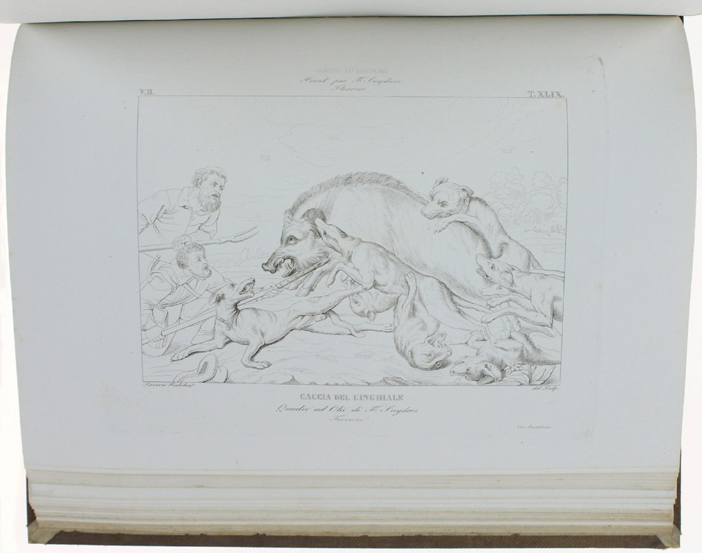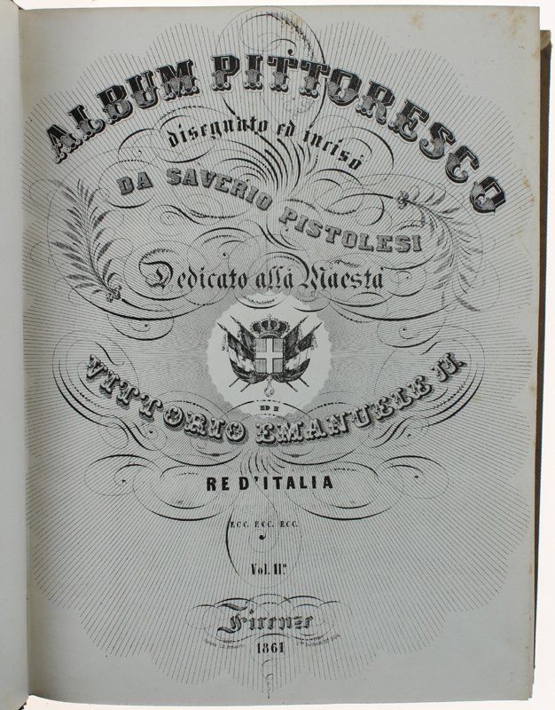 (Codice EK/0563) Tre volumi in 4° (335x265 mm) illustrati con 297 tavole disegnate e incise in rame dall'autore. Volume I: 199-2 pp. + 99 tavole. Volume II: 135-2 pp.+ 99 tavole. Volume III: 157-2 pp. + 99 tavole. Ogni volume con due frontespizi: uno tipografico (1851), uno aggiunto nel 1861, splendidamente ornato, con titolo "Album pittoresco", stemma sabaudo, dedicato a Vittorio Emanuele II. Nitida e fresca impressione su carta forte, testo riquadrato, grandi margini. Lievissime ingialliture alle pp. di testo dei voll. I e II; le tavole sono tutte in perfette condizioni. Grandi e solidi volumi, belle legature antiche in mezza pelle, nervi, fregi e titoli oro. Lieve menda a un'angolo della copertina posteriore del 1° volume. Per il resto splendido esemplare, in condizioni ottimali. Cliccare sulla foto per vedere altre immagini. ~~~ SPEDIZIONE IN ITALIA SEMPRE TRACCIATA