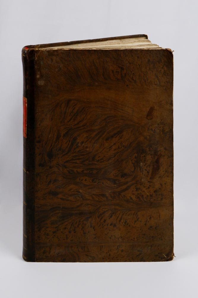 - legatura coeva in mezza pelle, fregi al dorso, tassello arancione con titoli oro, piatti in cartonato marmorizzato sui toni del marrone,