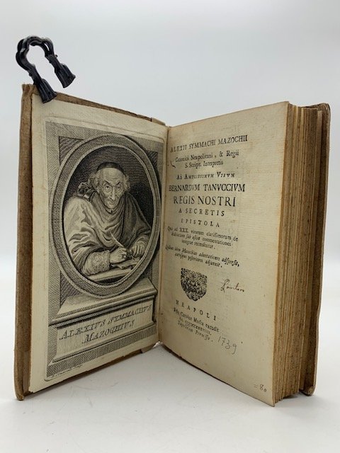 In 8 (cm 13,5 x 21), pp. 330 con illustrazione a piena pagina al verso del frontespizio raffigurante un'iscrizione, illustrazioni intercalate al testo raffiguranti scuri ed asce. Alcune gallerie di tarlo e forellini alle pagine (la galleria raggiunge, nella sua ampiezza massima, la misura di 2 cm circa con lesione di alcune parole del testo). Legatura di fine Sttecento in mezza pergamena (con piatti in cartone). Edizione originale di quest'opera in cui Mazzocchi, biblista ed archeologo, ragiona sulle asce presenti sulle lapidi sepolcrali romane a partire dal I secolo d. C., segni della sacralita' e dell'inviolabilita' del sepolcro. Mazzocchi aveva gia' espresso alcune sue teorie sulle asce sepolcrali romane in opere precedenti. A queste teorie si era opposto Ludovico Antonio Muratori nella dissertazione "Sopra l'ascia sepolcrale" del 1736 cui Mazzocchi aveva a sua volta voluto rispondere con quest'epistola dedicata a Tanucci nel 1739.