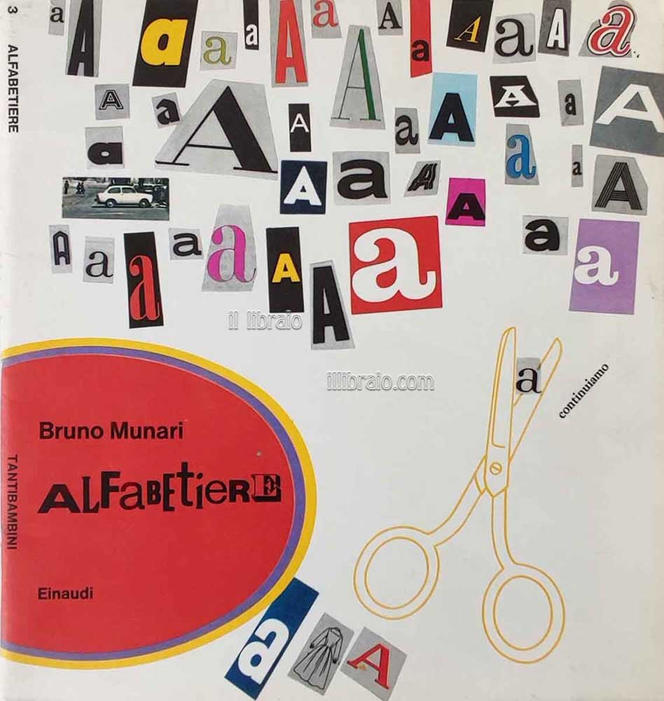 in 8°; pp. 32, compresa la copertina, (ill. in bn. e col.); br. spillata; coll. Tantibambini, # 3. Illustrazioni di Bruno Munari. Questo libro fa parte della meravigliosa collana Tantibambini diretta da Bruno Munari. 2^ ed. di una delle opere più celebri e ricercate del celebre artista (la 1^ uscì nel 1960), designer e scrittore milanese. "Cari Genitori, questo libro prescolastico è intitolato alfabetiere e non abecedario perchè le lettere che contiene non sono disposte secondo il metodo tradizionale: a b c., ma secondo le difficoltà che presentano per essere imparate dal bambino.Nel caso di questo alfabetiere il bambino può intervenire continuando a incollare nelle pagine le lettere dell'alfabeto che avrà prima scelto e ritagliato da vecchie riviste, così come io ho cominciato a modo di esempio"