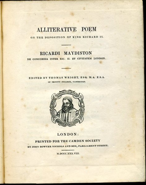 Bookplate inside front board. No other marks or inscriptions. No creasing to covers or to spine. Mainly clean, foxed very tight pages with very faintly marked embossed boards, gilt embossing and lettering to spine, water marks to a few page edges and no bumping to corners. 64pp. Fourteenth century poem written after the time King Richard fell into the hands of his enemies and before the intention of deposing him was publicly made known.