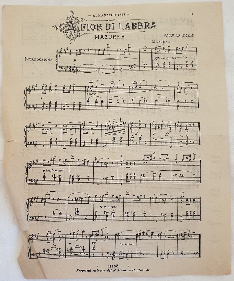 Partitura per pianoforte del 1881 della melodia di "A fior di labbra" di Marco Sala.<BR>GENERE: Mazurka ANNO: 1881 DIMENSIONI: In 8. cm 24,5x20 PAGINE: pp. 2 CONDIZIONI: Buone condizioni. usure marginali. Complete score for piano of 1881 of the melody "A fior di labbra" by Marco Sala. MUSIC: Mazurka STRUMENTI: piano, violins, cello, viola, bass<BR>YEAR: 1881 SIZE: In 8. cm 24,5x20 PAGES: pp. 2 CONDITIONS: Good conditions. Worn extremities