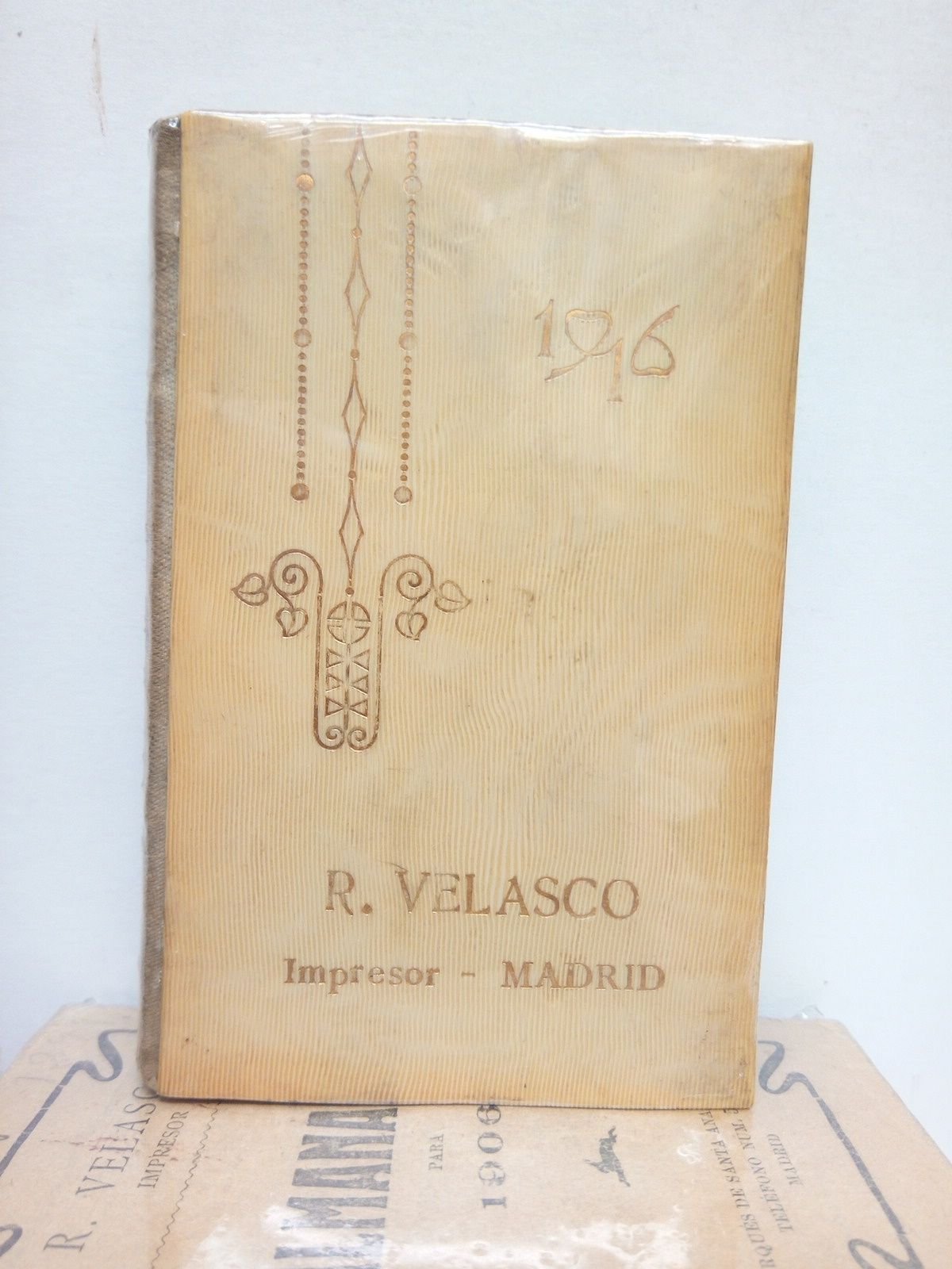 [S.l., pero Madrid]: R. Velasco Impresor, 1916.- 224 p.; 16º (10 cm); Tela Ed. y Pasta dura imitación hueso.- Cubierta anterior decorada y grabada en dorado.- RARO.* Lomito fatigado y cubiertas en buen estado, pero la posterior se ha combado ligeramente; las guardas se han pegado entre si y han perdido ciertos trocitos al despegarlas, que han sido restaurados en lo posible. RELOJES, CRONOLOGÍA, CALENDARIOS, ALMANAQUES.