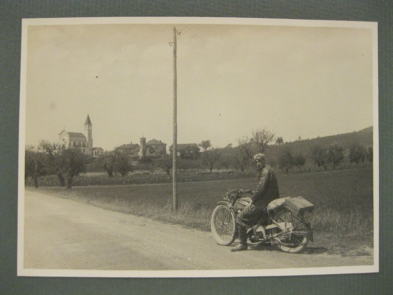 Fotografia originale in b/n vintage stampa alla gelatina ai sali d'argento, didascalia manoscritta al verso cm 16,5 x 11,5 montata su cartoncino bordato cm 23 x 17 che ritrae un uomo sulla motocicletta sulla strada del colle di Giovo nella valle dell'Erro. Sullo sfondo un paesino non identificato.