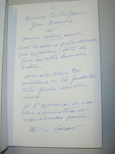 Edition originale, rehaussée de l’Archange au pur regard ardent par Patricia Nicolle, 1 vol. in-8 br., Arstella, Paris, 1991, 73 pp. Etat très satisfaisant (couv. lég. frottée) pour cet exemplaire de l’édition originale enrichi d’un très bel envoi de l’auteur à l’académicien, grand médecin, poète et humaniste, le professeur Jean Bernard. Avec signature de l'auteur.