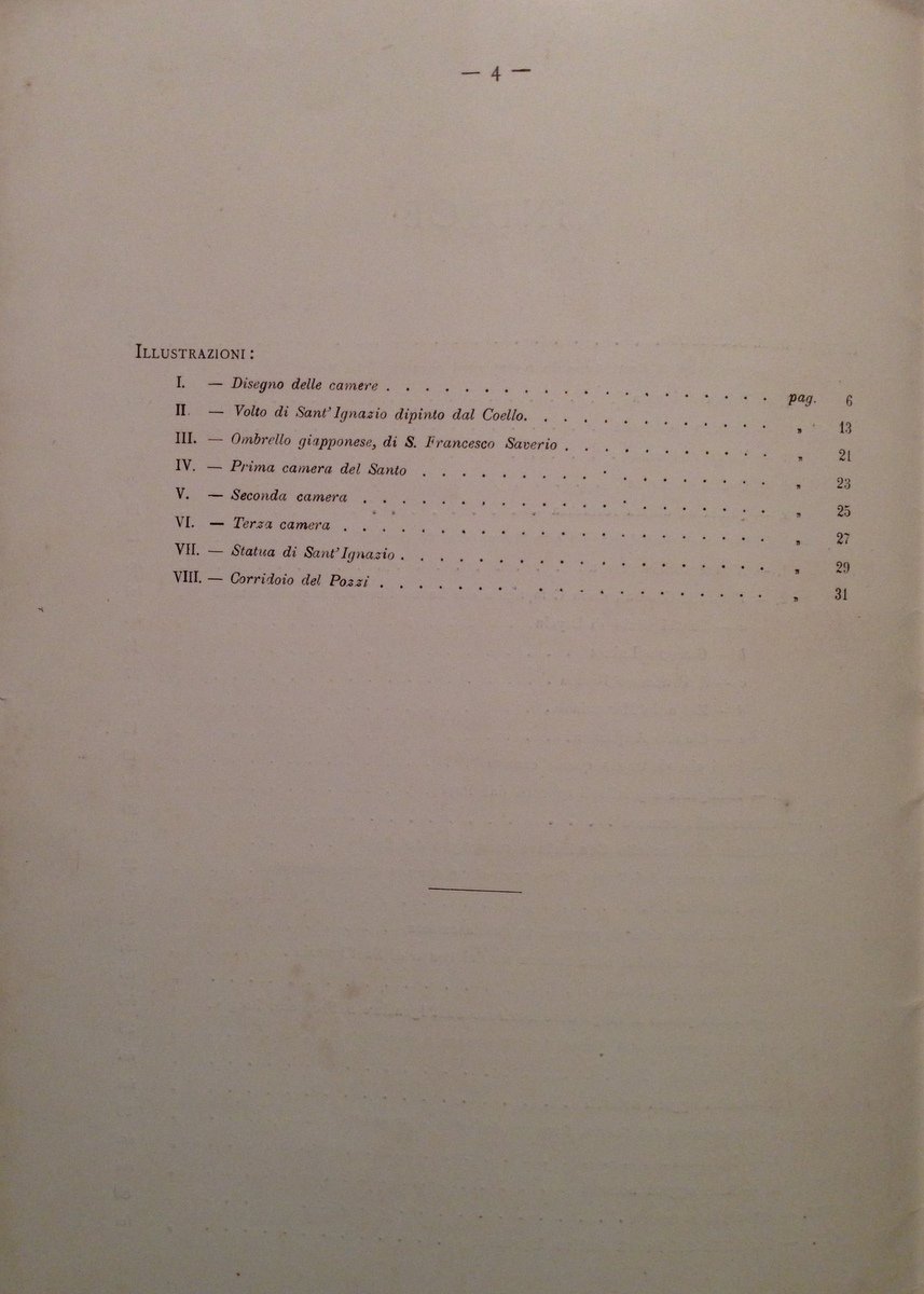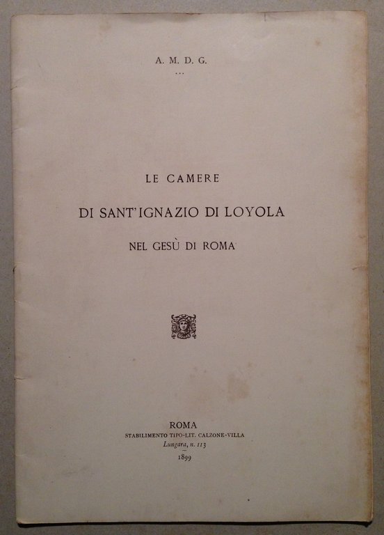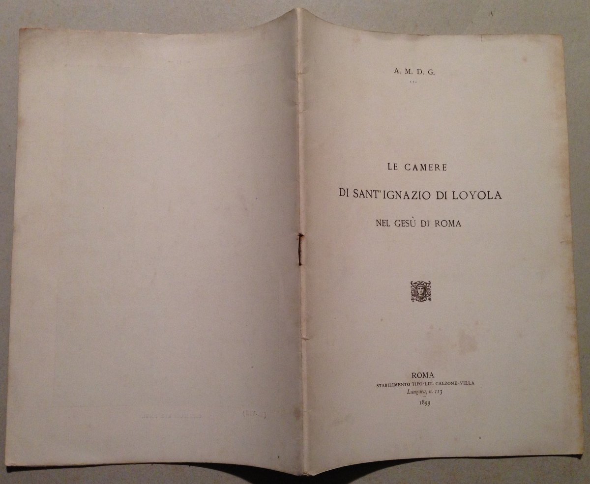 A.M.D.G., Le camere di Sant'Ignazio di Loyola nel Ges√π di Roma Stabilimento Tipo.-Lit. Canzone-Villa, Roma, 1899; cm. 27,5x19,5; pp. 30; con ill. n.t. e a piena pag.; brossura editoriale. Condizioni di conservazione Esemplare in buono stato con leggere tracce d'uso e del tempo; brossura editoriale con minime bruniture e con minimi strappetti ai margini. OPEB.5051 MT