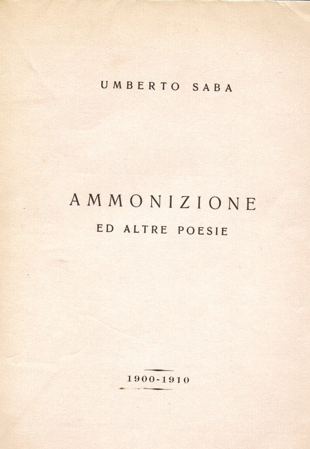 In-8° (208x152mm), pp. 79, (1), brossura editoriale con sovraccoperta incamiciata. Perfetta copia entro velina. Prima edizione, non destinata al commercio, tirata a 600 esemplari numerati (esemplare n° 73, dedicato ad personam a Rocco Lalli, con firma autografa di Saba alla giustificazione di tiratura). Impresso in autoedizione, a cura di Virgilio Giotti. 'La presente edizione non è messa in vendita a mezzo delle Librerie, e viene inviata unicamente contro assegno di L.10 - franco di spese. Per l'estero spese postali in più . Dirigere richieste direttamente all'Autore (Trieste, Via S. Nicolò 30)'. Scrive Saba nella prefazione: 'Questo libro raccoglie - sotto il titolo della prima che ho scritta - il testo definitivo di tutte le poesie che voglio conservate dell'adolescenza e della giovinezza, anteriori a 'Trieste e una donna'. Castellani, Bibliografia di Umberto Saba, I.8. Spaducci, p. 256. Gambetti / Vezzosi, p. 793: 'Alla fine degli anni '70 la libreria di Saba disponeva ancora di alcune copie del volume. Abbastanza raro e molto ricercato'.